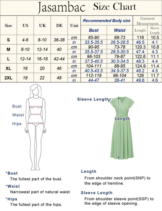 Jasambac Women Elastic Waist Midi Dress Short Sleeve V-Neck Flared A-Line Dress
