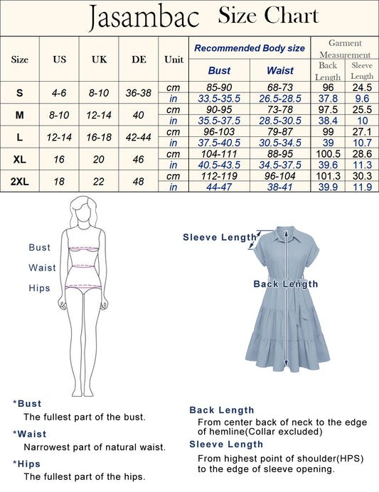 Jasambac Women Shirt Dress Short Sleeve Lapel Collar Elastic Waist A-Line Dress
