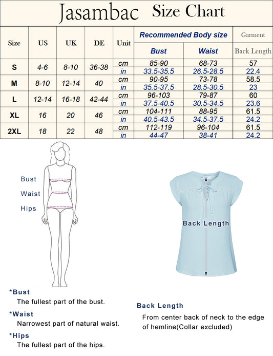 Jasambac Women Notched Neck Tops Loose Fit Casual Cap Sleeve Lace-up Neck Tops
