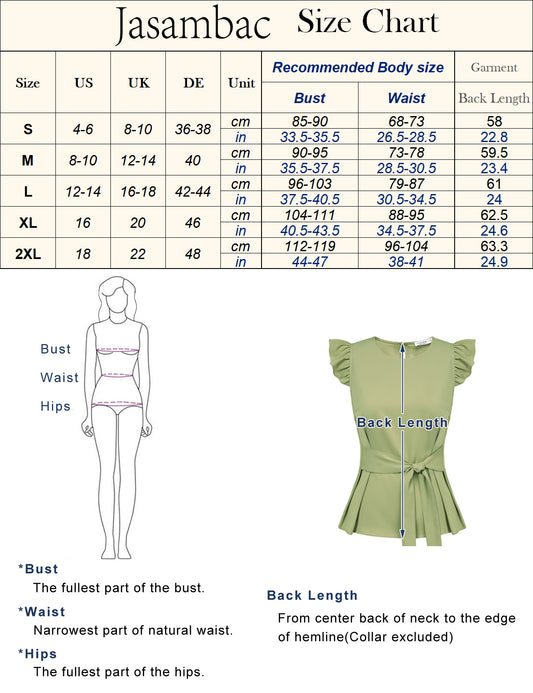 Jasambac Women Belt Decorated Tops OL Flutter Sleeve Crew Neck Pullover Tops