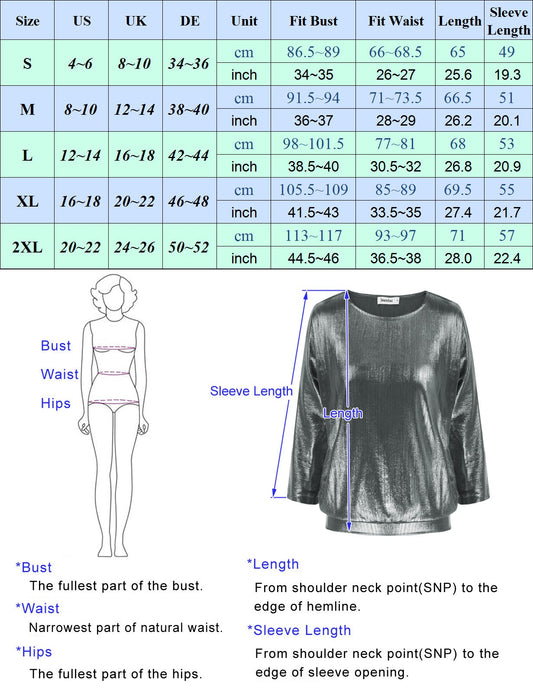 Jasambac Women Metallic-Like Tops Loose Fit 3/4 Sleeve Crew Neck Tops